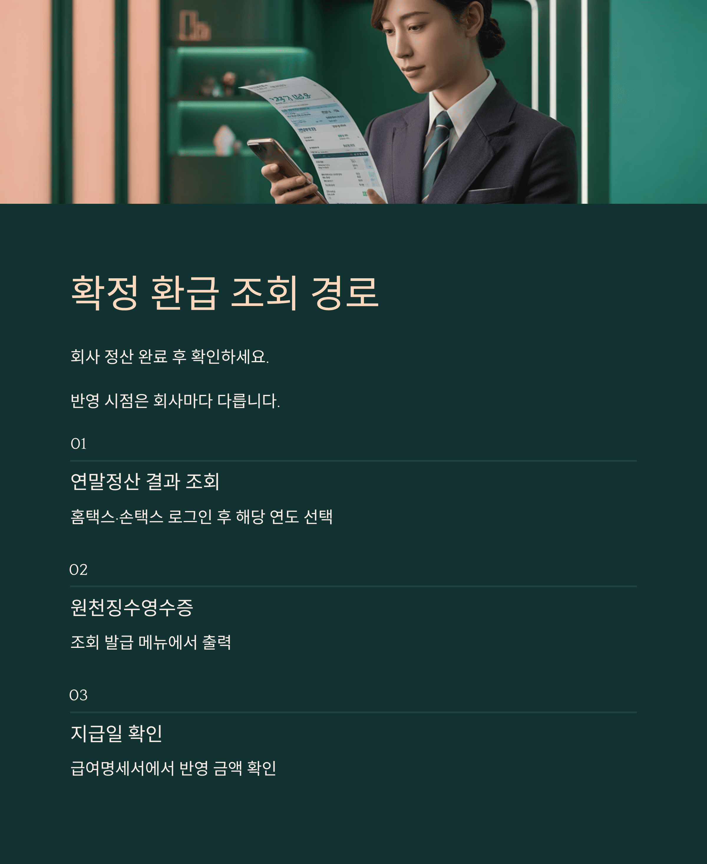 | 확정 환급 | 회사 정산 완료 후 홈택스 연말정산 결과 조회 또는 근로소득 원천징수영수증에서 확인합니다. |