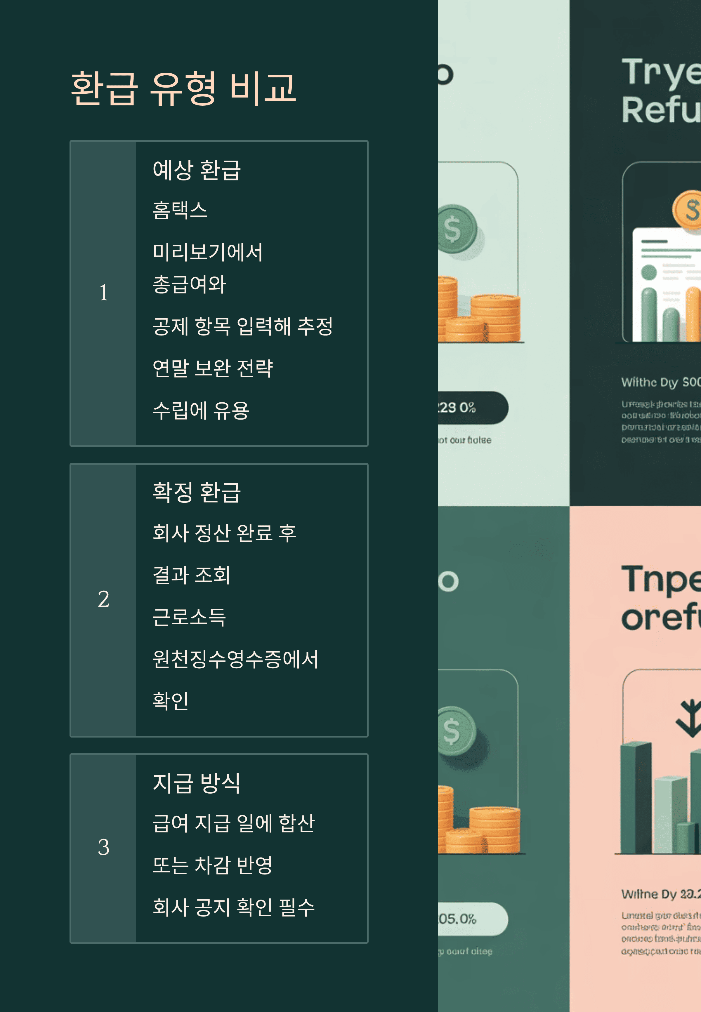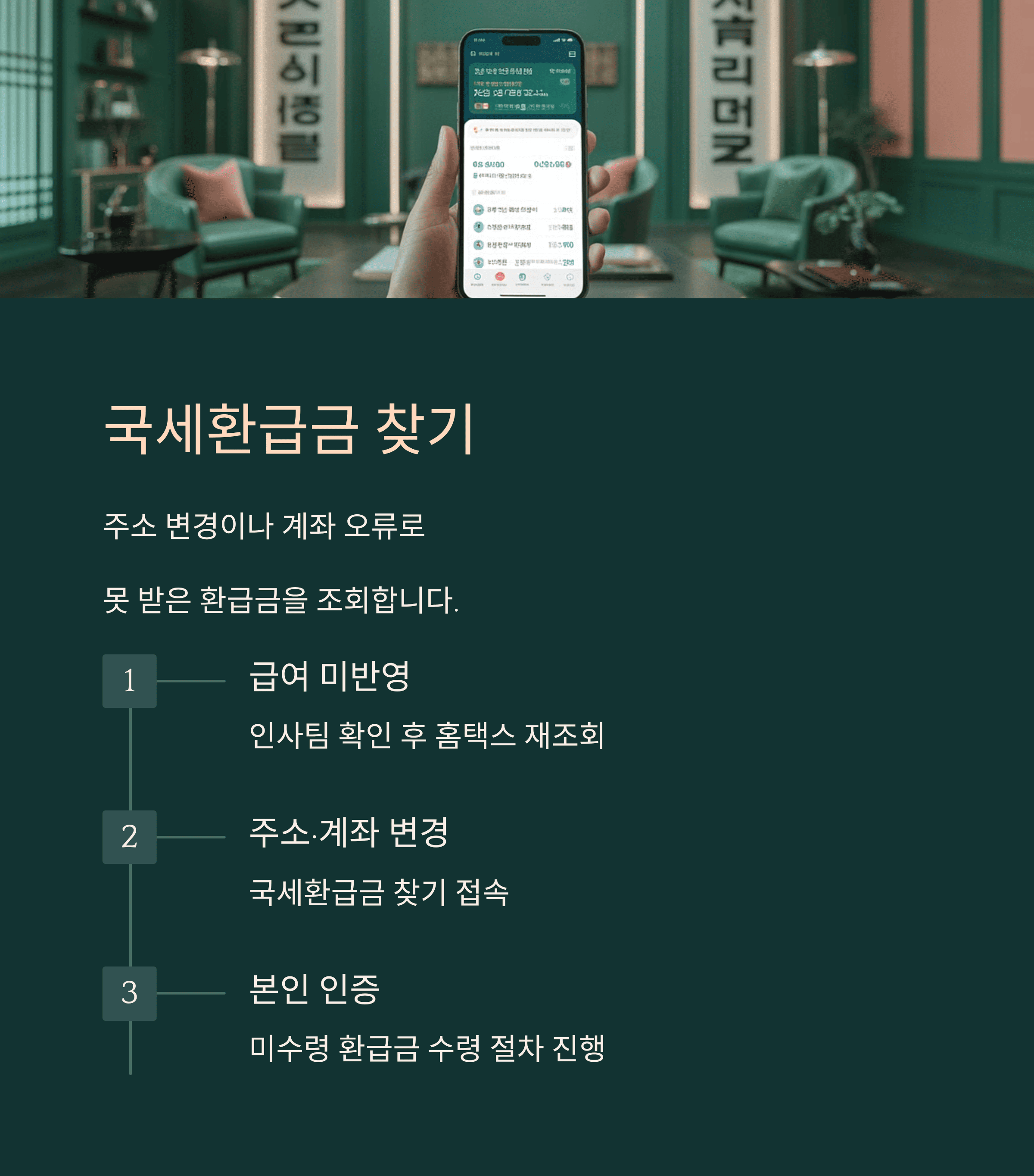 | 회사 급여로 환급 반영이 안 된 경우 | 인사팀에 반영 일정 확인 → 홈택스 결과 재확인 → 필요 시 국세환급금 찾기에서 개별 환급 여부 확인 |