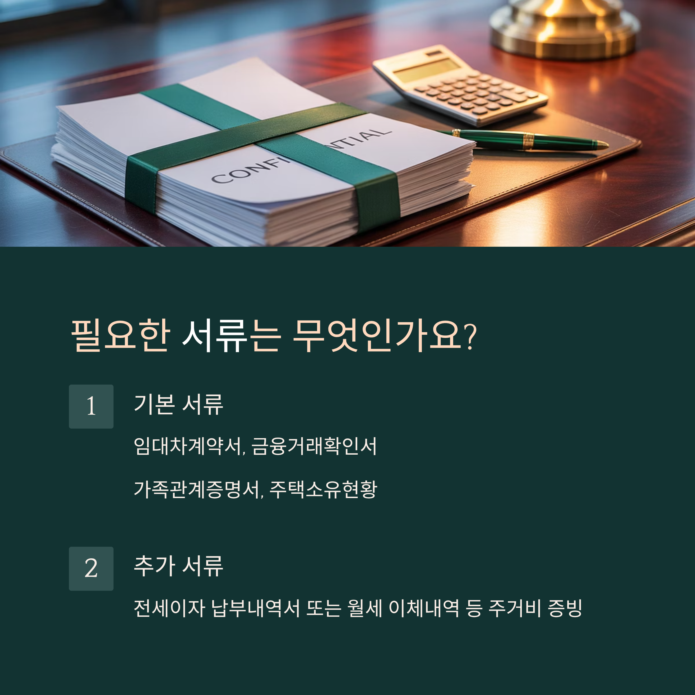 | 기본 서류 | 임대차계약서(확정일자), 금융거래확인서/월세이체증 가족관계증명서, 주택소유현황 |
